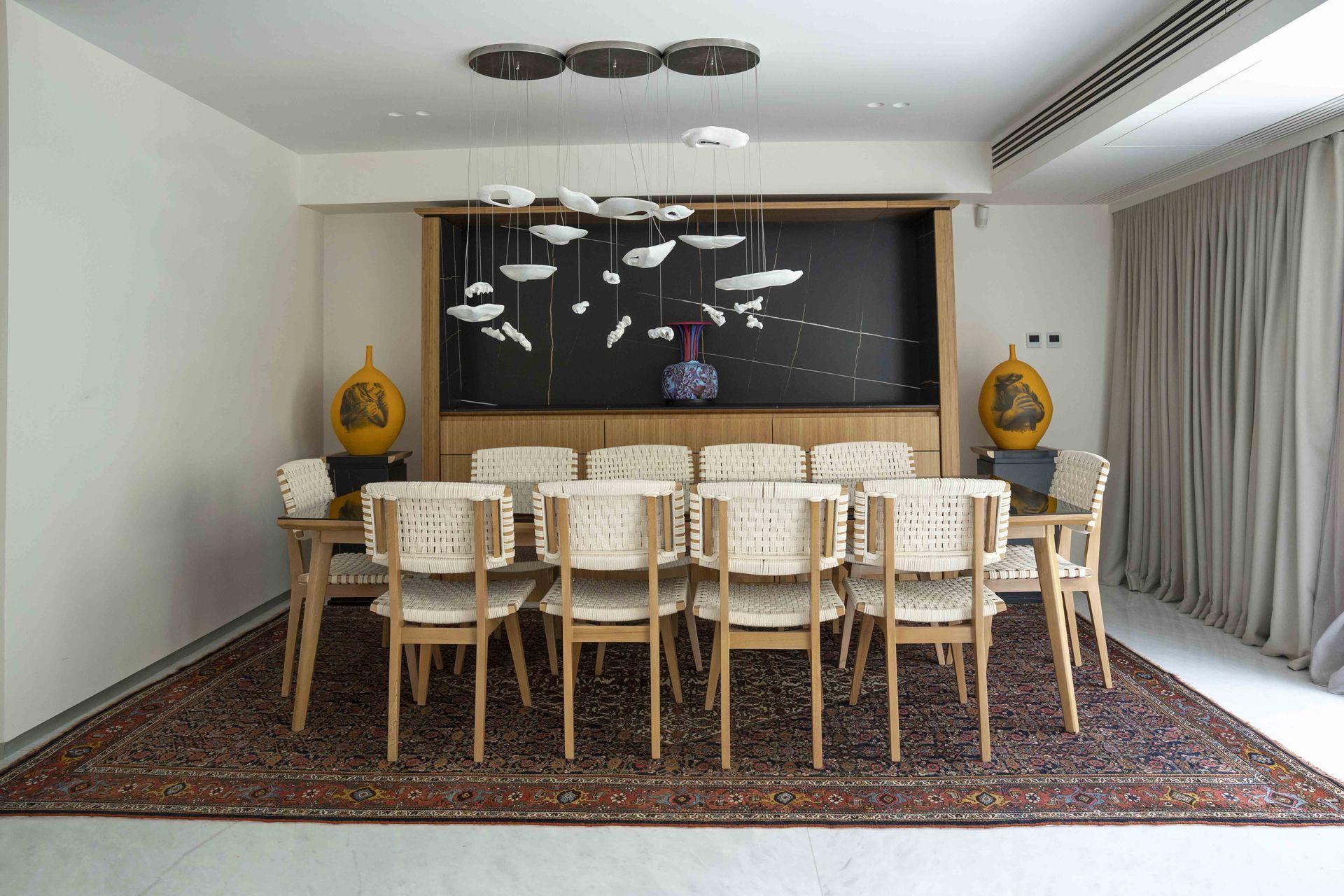 اگر فضای کافی برای میز غذاخوری وجود دارد، بهتر است اندازه فرش به گونهای انتخاب شود که تمامی صندلیهای دور میز، حتی زمانی که بیرون کشیده میشوند، روی فرش قرار گیرند. این امر نه تنها به زیبایی فضا میافزاید بلکه به جلوگیری از آسیب دیدن لبههای فرش و همچنین راحتی بیشتر در هنگام استفاده کمک میکند. اما اگر فضا محدود است، میتوان سایز فرش غذاخوری را به گونهای انتخاب کرد که صندلیها تنها در حالت چسبیده به میز به طور کامل بر روی فرش قرار گیرند و زمان استفاده از صندلیها پایههای عقبی آن روی زمین باشد. برای میز غذاخوری چهار نفره فرشهای پردهای که مساحتی بین ۴ تا ۵ متر دارند و برای میز غذاخوری شش نفره فرشهای ۶ متری خانه دیدار بهترین انتخاب خواهند بود. برای میزهای هشت نفره به بالا هم بهتر است از فرشهای بزرگ پارچه استفاده شود.